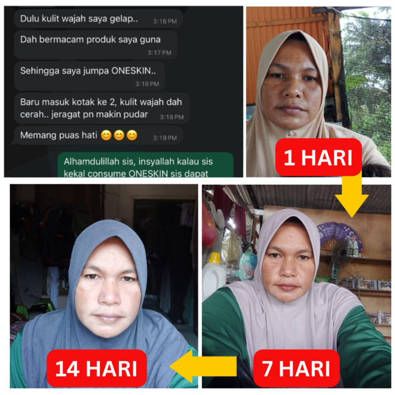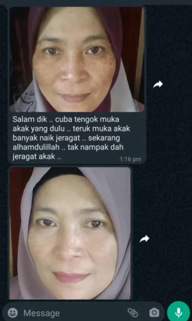 Baru 5 hari amalkan ONESKIN, jeragat yang dah lama semakin pudar! Tona kulit pun nampak semakin sekata dan lebih cerah ![]()