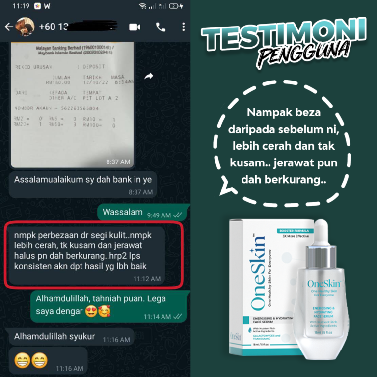 Kesan boleh dilihat seawal 7 hari sahaja jika mengambil ONESKIN ni dengan betul dan konsisten. Perbanyakkan minum air kosong secukupnya bagi kesan maksima.