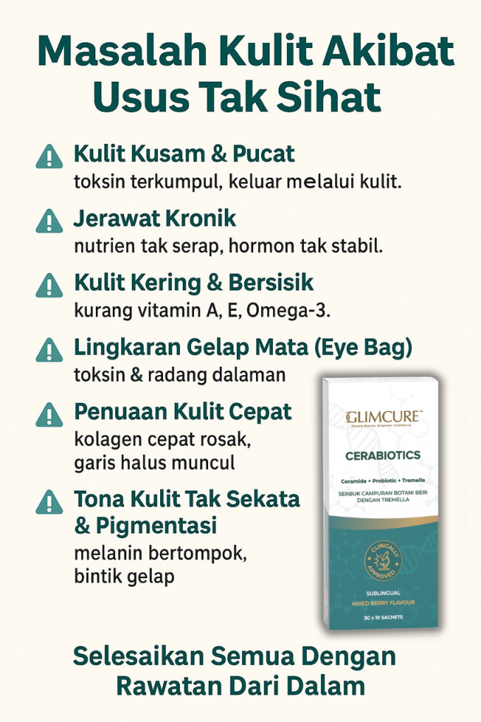 Usus yang kotor atau tidak sihat menyebabkan toksin terkumpul dalam badan. Bila toksin tak dapat keluar ikut usus, ia akan keluar melalui kulit — hasilnya kulit nampak kusam, pucat dan tak bermaya.